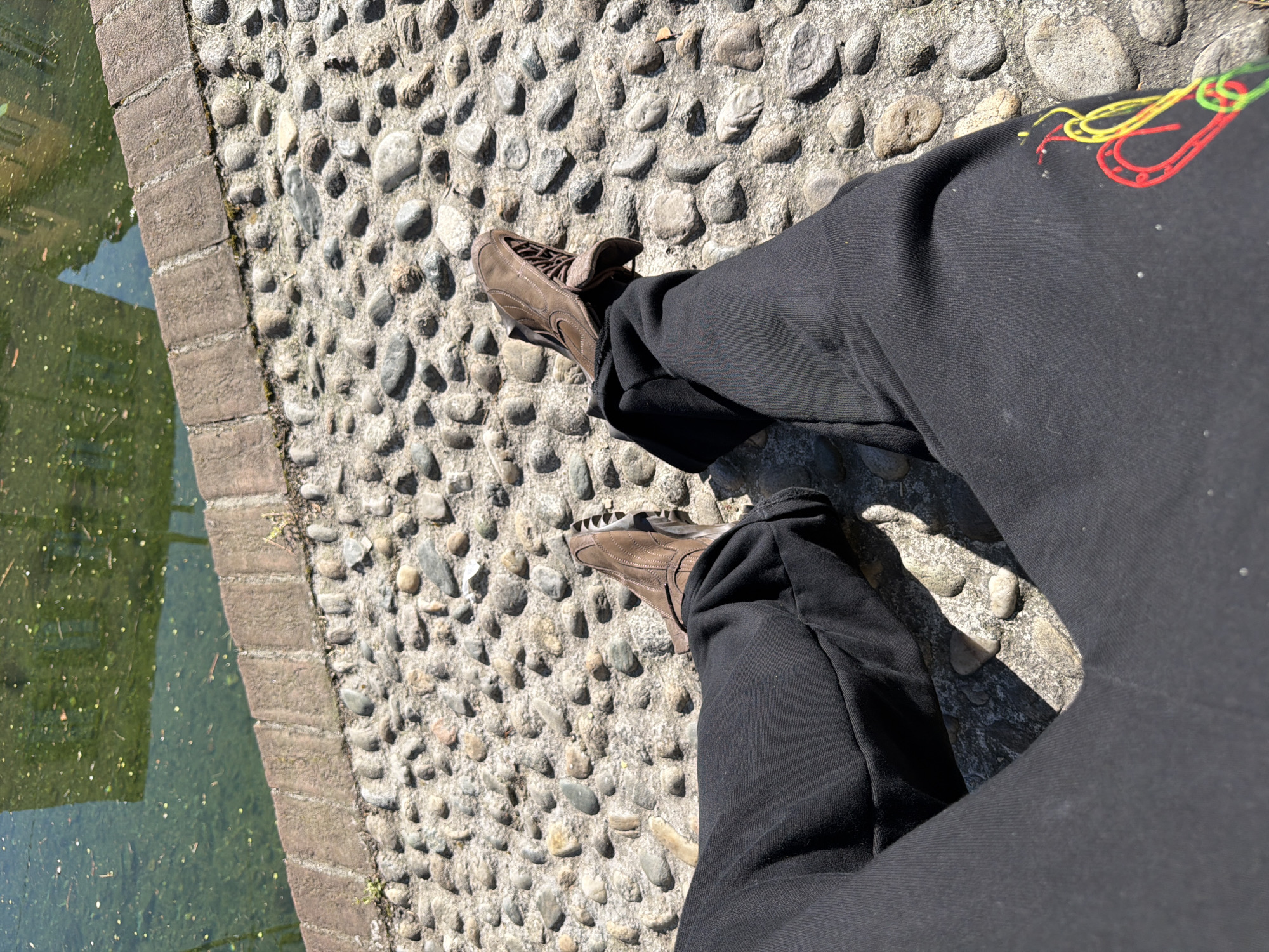 A first-person, downward perspective captures a person's lower legs and feet on a sunny day in Milan, Italy. The individual wears black trousers, featuring a red, yellow, and green intertwined embroidery resembling abstract loops on the right leg, and brown lace-up shoes with visible tread. Their feet rest on a light-colored cobblestone pathway. Immediately beyond the pathway is a low, single-course brick wall, bordering a murky, green-tinted canal or waterway containing floating detritus. Reflections of a building, exhibiting window-like structures, are visible on the water's surface. This environment is characteristic of Milan's Navigli district.