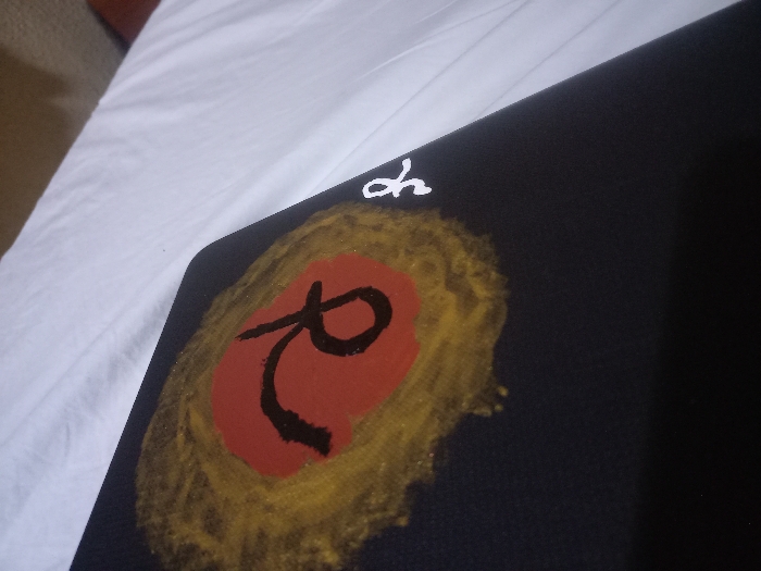 The image displays a dark, possibly black, rectangular canvas or board positioned at an angle on a white, crumpled fabric surface. The fabric, likely a bedsheet, is visible in the upper right and top portions of the frame. A painted design occupies the central and left-central area of the dark surface. This design consists of an irregular red shape, roughly an oval, surrounded by a border of shimmering gold paint that extends outwards. Within the red shape, a black, stylized character resembling a lowercase "r" is centrally depicted. In the upper right quadrant of the dark surface, a small, white, stylized letter "y" or similar symbol is painted. No individuals or active interactions are present. The scene is located in Kuje, Nigeria.