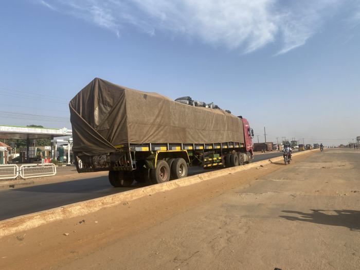 This image depicts a wide, multi-lane roadway in Sabon Gari, Nassarawa, Nigeria, under a bright, partly cloudy sky. A large, red-cabbed articulated truck with a multi-axle trailer is positioned on the right side of the paved road. The truck's trailer is covered by a loosely secured, dark brown tarpaulin, revealing some dark-colored cargo items on top. Yellow and black reflective markings are visible along the side of the trailer, and the rear undercarriage appears weathered with rust. To the left of the truck, a petrol station with a distinctive green and white canopy and multiple fuel pumps is visible, separated from the road by a low white metal barrier. The road's median and shoulders consist of reddish-brown earth. Further down the road, to the right of the truck, a person on a motorcycle, wearing a light-colored shirt, is present in the lane of traffic. In the distance, other vehicles and structures line the roadside, indicating a busy thoroughfare. Overhead power lines are visible against the sky.