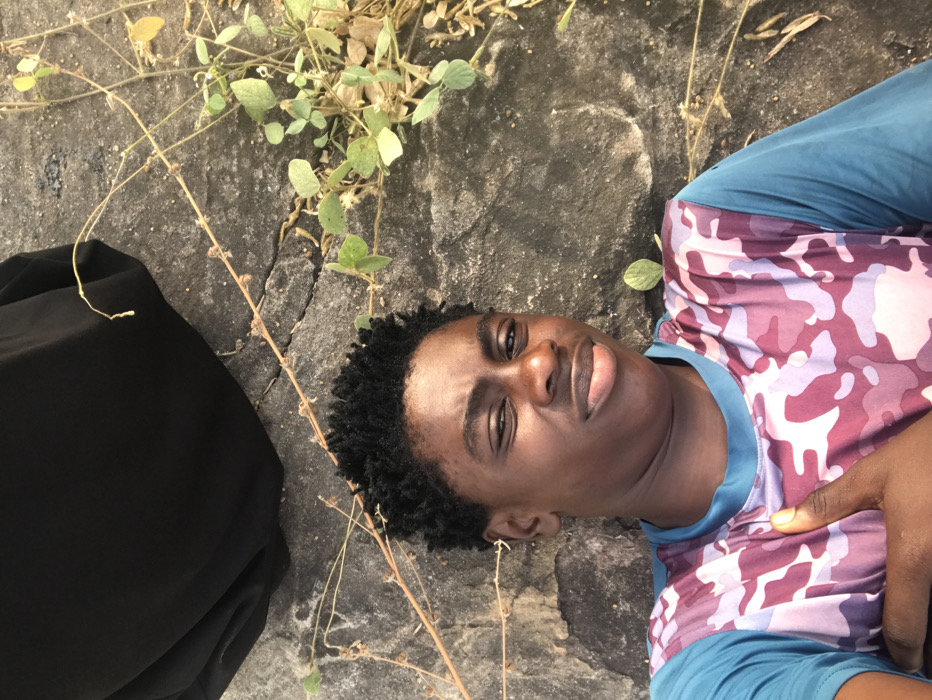 A dark-skinned person with short, dark hair lies on a rough, grey surface, possibly concrete