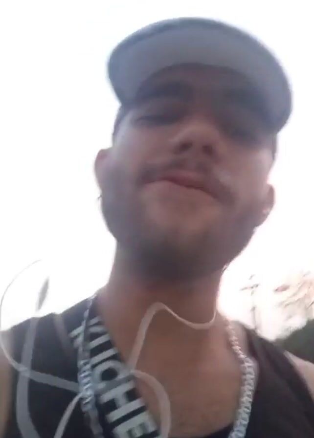 A low-angle close-up shot shows a man with a beard, wearing a backward baseball cap, a black tank top, a silver chain, and white earphones