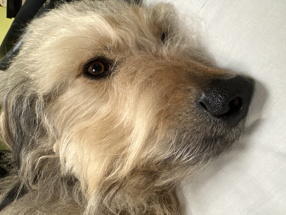 - "A close-up, eye-level photograph depicts the head of a shaggy-haired dog resting on a light-colored, soft fabric surface" by FM-wE9nL2, licensed under CC BY 4.0