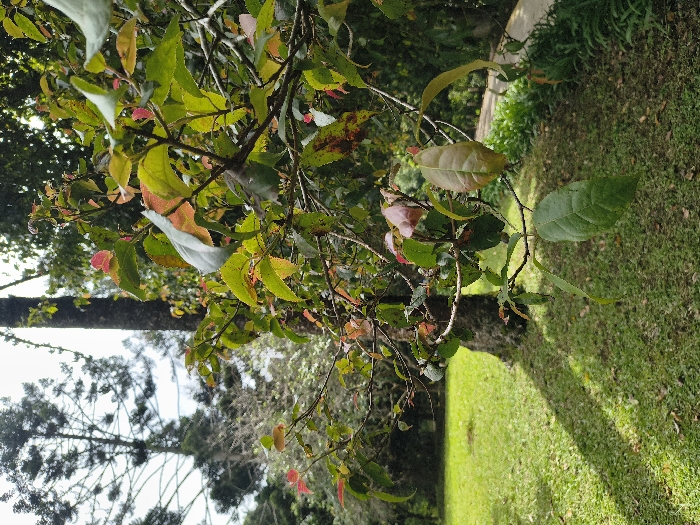 The image captures a lush, green landscape. A tree's branches with green, red, and yellow leaves extend into the frame, contrasting with the vibrant green lawn below. In the background, another tree with delicate needles is visible. A pathway and additional greenery add depth and texture to the scenery, evoking a natural, outdoor setting.
