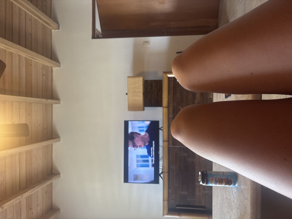 The image depicts an indoor scene within a residence in Olde Yard Village, British Virgin Islands, captured from a first-person perspective. In the immediate foreground, the bare, tanned legs of an individual are visible from the upper thighs to just above the knees, positioned slightly apart. Between the legs, on a light-colored, textured surface, sits an open aluminum can, primarily blue and white, with the visible text "Delight Iced Coffee Mocha." In the midground, a dark-colored flat-screen television is centered on a long, dark wooden cabinet or credenza featuring bamboo-style trim. The television screen displays a man wearing glasses and a dark shirt, with white subtitles reading "Are you okay, ... wanting to be." The background on the television screen shows white architectural elements with blue window frames. To the right of the television, a table lamp with a rectangular, light-colored fabric shade and a dark, textured base rests on the cabinet. The wall behind these objects is a plain, light off-white color. In the background, to the far right, a partially open brown wooden door reveals a glimpse of a light-colored wall in an adjacent room. A light switch or electrical outlet is visible on the wall to the right of the lamp. The ceiling features exposed wooden beams and lighter wooden planking, with a dark-colored ceiling fan, incorporating a light fixture that emits a warm glow, visible towards the top center. No direct human interaction is depicted; the scene suggests a person relaxing while viewing television.