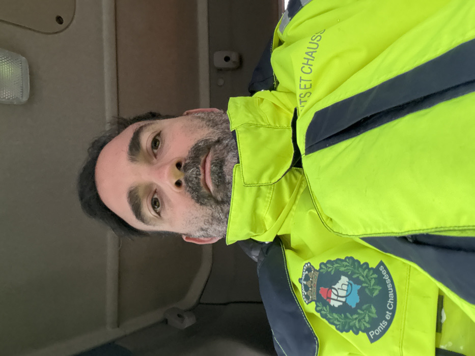 A bearded man in a neon yellow jacket with dark trim faces the camera. The jacket has a badge with a crown, the silhouette of Luxembourg, and the words "Ponts et Chaussées." He appears to be inside a vehicle, judging by the interior lighting and paneling visible. The image is rotated counterclockwise.