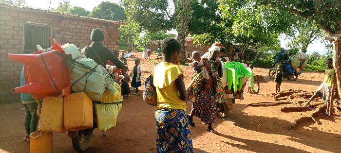A sunlit village scene shows people and a motorbike loaded with goods. A woman in a yellow top and blue skirt stands in the foreground, her back to the viewer. Two motorbikes are heavily laden with supplies, including chairs and containers. Several people, including children, are visible around the motorbikes. A brick building is visible on the left, and lush green trees provide shade. The ground is red dirt, indicating a rural or developing area.