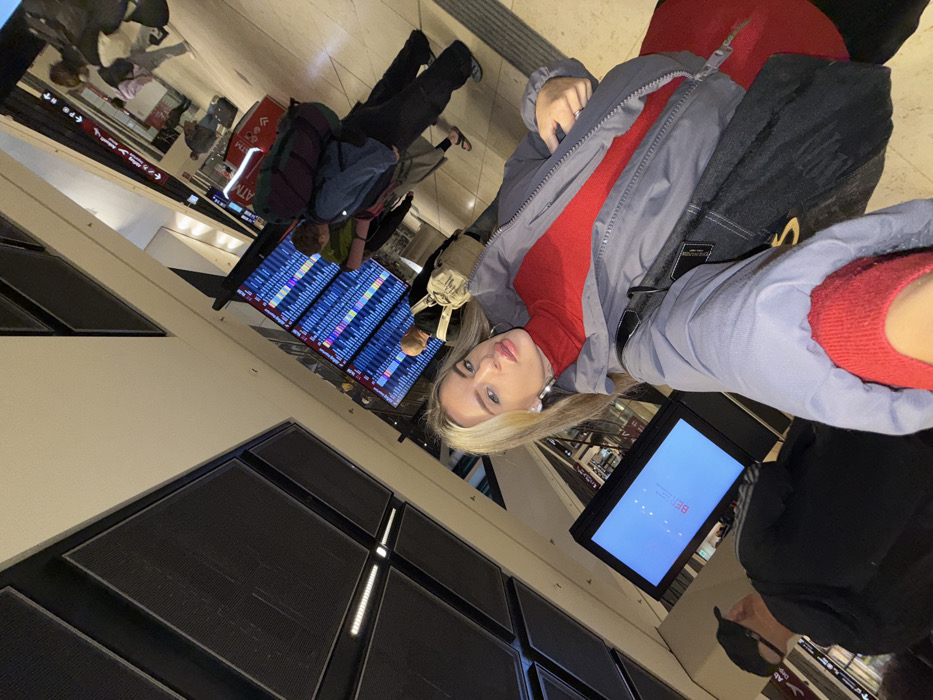 An indoor scene depicts an individual taking a selfie within Berlin Brandenburg Airport (BER) in Schönefeld, Germany. The subject, a woman with long blonde hair, wears a red turtleneck shirt and a grey puffer jacket, with white earbuds visible. She holds a dark bag with her left hand, which is visible in the foreground. Her right hand, partially obscured, is held up towards the camera. In the mid-ground and background, multiple individuals are present. To the right of the subject, two large digital flight information display screens show illuminated text and colored graphics. Several travelers are observable in front of these screens, some appearing to view the information. One person directly behind the subject wears a dark cap and jacket, partially visible. Another individual further back is seen with a prominent green/dark backpack. The environment features a light-colored tiled floor with a tactile paving strip. The ceiling consists of black rectangular panels with integrated linear lighting elements. A smaller, vertical digital display screen with a blue background and a red logo is visible to the left of the main subject. Red directional signage, including an "ATM" indicator, is discernible in the distant background. The overall setting is characteristic of a modern airport terminal.