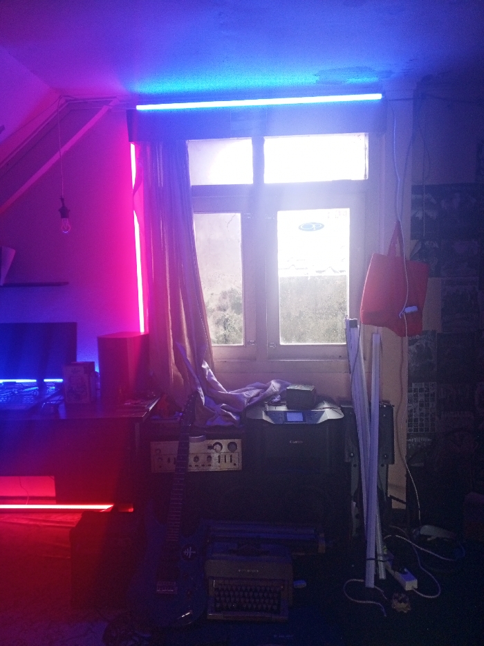A room lit by blue and pink neon lights features a window with curtains. Under the window, there is a printer, an amplifier, and a guitar leaning against them. An old typewriter sits on the floor. There's a monitor and other items on a desk. A red tote bag hangs on the right. Posters are on the wall. Cables and other objects are on the floor.