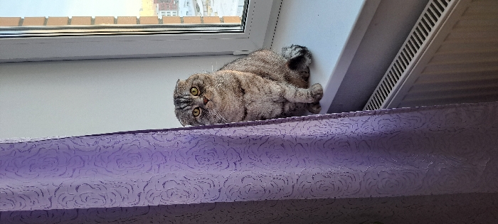 - "A gray and tan Scottish Fold cat rests on a window ledge, its body turned toward the radiator" by FM-FrnGi2, licensed under CC BY 4.0