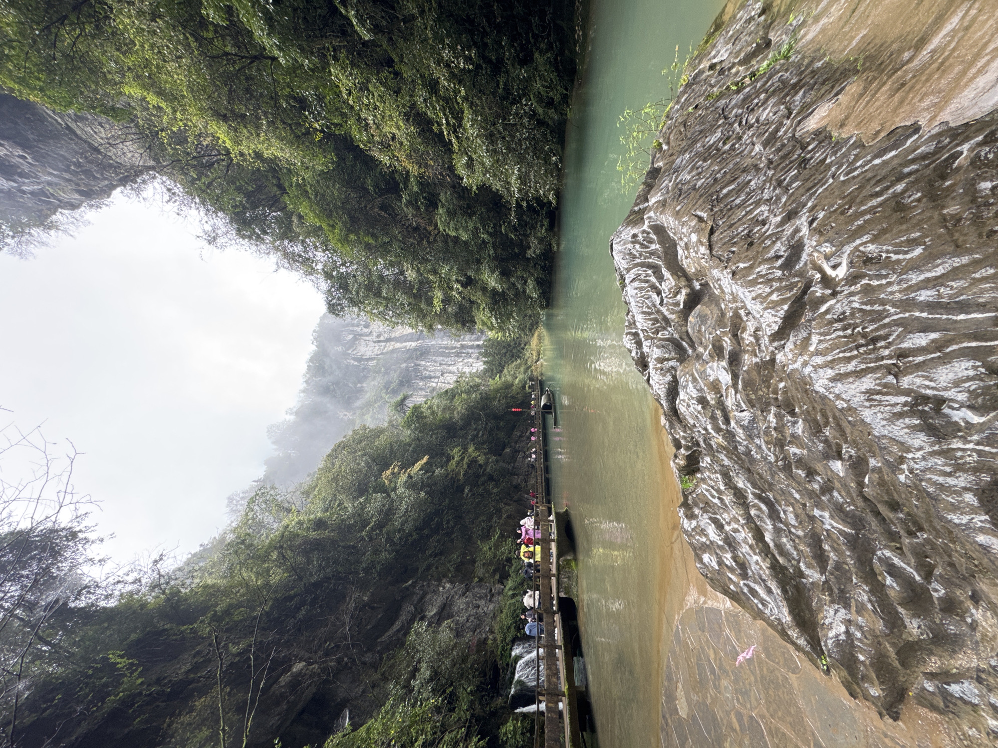 scenic view of a gorge in Wulong District, Chongqing, China. The gorge is characterized by steep cliffs covered with dense green vegetation. A river runs through the gorge, its water appearing a murky green color. A narrow pathway, likely a walkway or bridge, extends along the river. Several people are visible on the pathway, appearing small in the overall scene, suggesting the scale of the landscape. A large, wet rock formation dominates the right foreground. The weather seems overcast, contributing to a muted, slightly grayed-out color palette.