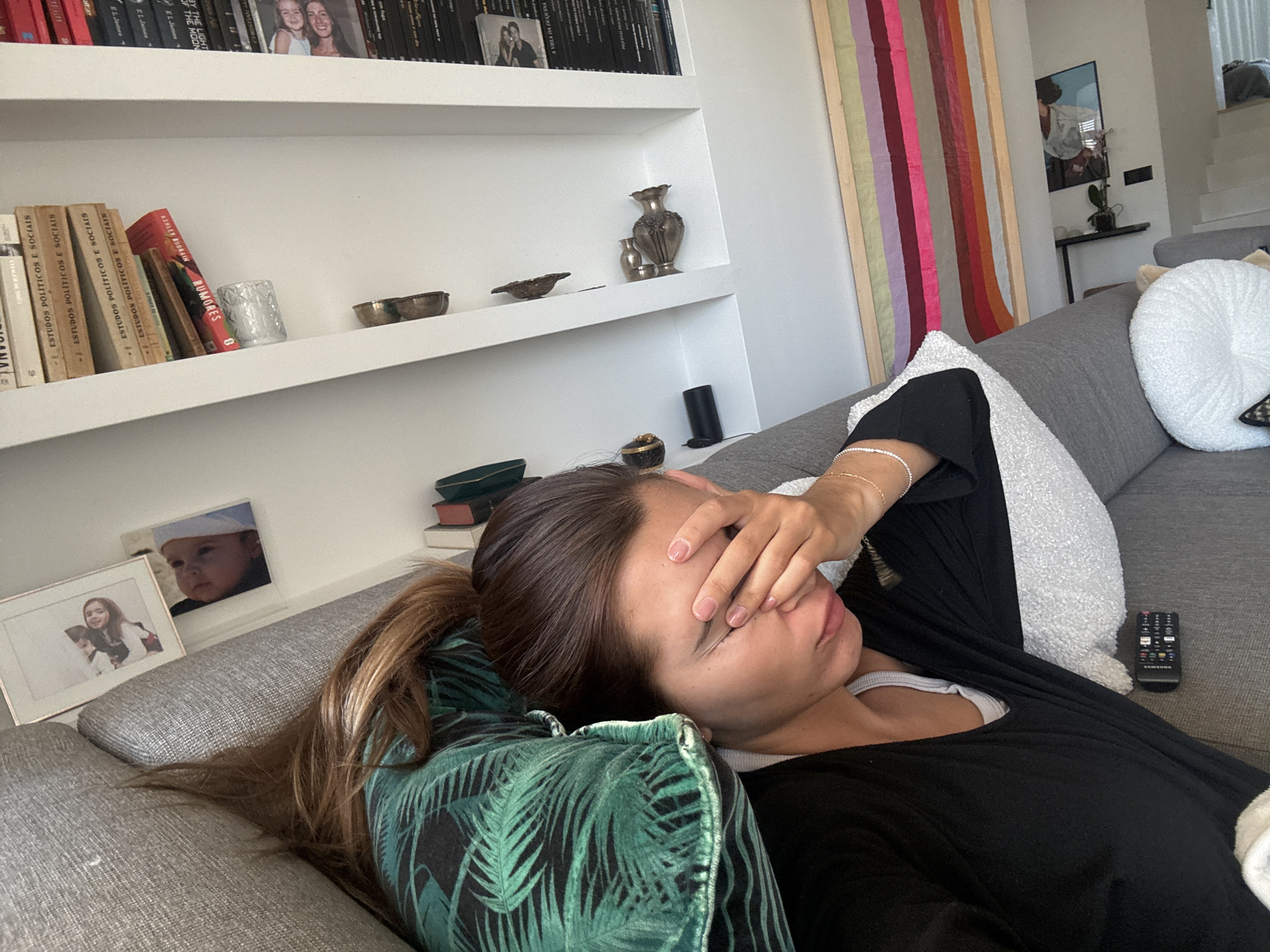 This image depicts a residential interior located in Vila Nova de Gaia, Portugal. A female individual with brown hair, pulled back into a ponytail, is positioned on her left side on a grey fabric sofa. She is wearing a black long-sleeved top over a white tank top. Her right hand, adorned with a delicate gold chain bracelet and light pink nail polish, is covering her eyes and the bridge of her nose. Her head rests on a green pillow featuring a dark tropical leaf pattern. A white textured cushion is partially visible to her right, and a black Samsung television remote control lies on the sofa next to it. Behind the subject's head, resting on the sofa's backrest, are two framed photographs: one showing an older child in a white cap, and another displaying an adult female with a younger individual. The background features a white wall with built-in white shelving. The top shelf contains numerous books, some identifiable by their Portuguese titles such as "ESTUDOS POLITICOS E SOCIAIS," alongside framed photographs, including one of two young girls and another of a couple. The shelf below holds various decorative metallic bowls and vases, specifically a larger ornate silver vase, two smaller metallic vases, and a translucent glass votive holder. Further to the right in the background, a vertical wall hanging with multi-colored fabric strips (including pink, purple, red, and orange) on a wooden frame is present. Below this, a black side table supports a small potted plant, positioned beneath a wall-mounted framed picture. A section of white stairs with a grey railing is visible in the upper right background, suggesting a multi-level structure.