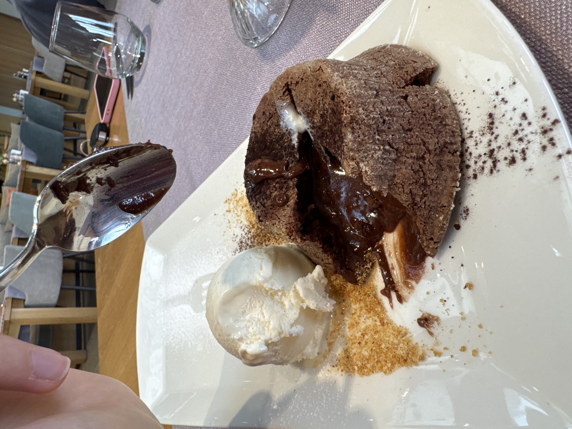 - "partially eaten chocolate lava cake with a scoop of vanilla ice cream on a white rectangular plate" by FM-yysqq1, licensed under CC BY 4.0