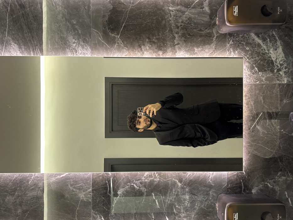 - "A young adult male is depicted in a mirror selfie within a modern public washroom environment" by FM-CyJrW2, licensed under CC BY 4.0