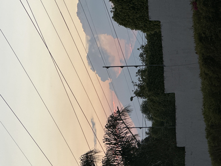 The image displays an exterior scene captured during twilight, consistent with either sunrise or sunset, over the city of Puebla, Mexico, facing towards the west. The upper portion of the frame features a graduated sky, transitioning from a light yellow at the top to soft pink and orange hues near the horizon, indicative of a low sun angle. Numerous dark utility lines diagonally traverse the sky, intersecting at various points. In the mid-ground, the faint, hazy silhouettes of two large stratovolcanoes are visible against the colorful sky. The left volcano, identifiable as Popocatépetl, exhibits a distinct conical peak with a small, localized reddish-orange glow near its summit, suggesting volcanic activity. To its right, the broader, more irregular silhouette of Iztaccíhuatl is partially obscured by grey-blue clouds that feature some pink coloration on their undersides. Below the volcanoes and clouds, a layer of dense, dark green foliage, including palm fronds on the far left, occupies the central portion of the image. A black streetlight fixture, mounted on a pole, is visible against the sky, positioned to the left of the scene's central axis. A grey utility pole with multiple cross-arms supporting several power lines stands in the center-right. The lower mid-ground features a light-colored, likely concrete or stucco, masonry wall with an irregular, stepped top edge, running horizontally across the frame. Below this wall, a strip of dark green ground cover or low-lying bushes is present, with a small patch of red flora visible towards the right edge. No individuals or active interactions are discernible within the frame.