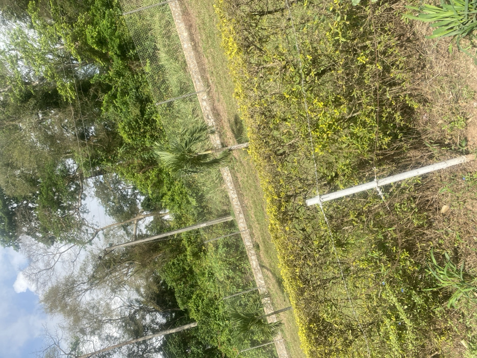 The image displays an outdoor scene in Odo Ona, Nigeria, featuring a multi-tiered landscape under a partially cloudy sky. In the foreground, a low, dense hedge with primarily green and yellow foliage extends horizontally. A light-colored cylindrical post with two strands of barbed wire is vertically positioned in front of this hedge, slightly off-center to the right. The ground directly beneath the hedge shows dry grass and sparse vegetation. Immediately behind the hedge, a gently sloping grassy area is visible, dotted with two small palm trees, one on the left and another towards the center-right. This grassy expanse is bordered by a chain-link fence, supported by a low, light-colored stone or concrete retaining wall that runs horizontally across the midground. Beyond the fence and retaining wall, the terrain rises steeply into a dense, forested hillside. This background features numerous tall trees with varied foliage, including lush green canopies and some trees with lighter, sparser branches. A grey utility pole with overhead wires is discernible on the left side, extending upwards into the tree line. The top portion of the image reveals a light blue sky with scattered white cumulus clouds. No human figures or discernible actions are present.