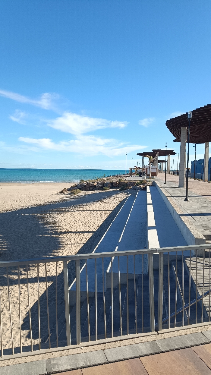 The image depicts a sunny coastal scene in Sagunto, Spain. In the immediate foreground, a light-colored metal railing with vertical bars spans the lower section of the frame, situated above a paved area of reddish-brown and grey tiles. Beyond the railing, a light brown sandy beach occupies the left midground, marked by prominent, elongated, dark shadows cast from structures to the right. A low, irregular rock barrier with minimal vegetation separates the beach from an elevated promenade. Centrally, a grey concrete access path, appearing as a ramp or stairs, descends from the promenade level to the beach, also casting long shadows. To the right midground, a wide, tiled promenade extends into the distance, lined with a series of modern pergolas. These pergolas feature dark, curved, slatted roofs supported by light-colored pillars. Tall, dark streetlights with white fixtures are regularly spaced along the promenade. In the background, the turquoise-blue Mediterranean Sea stretches to the horizon, meeting a clear, bright blue sky with scattered wispy white clouds. A faint, distant landmass or structure is visible on the far left horizon. A single, small, dark human figure is observed walking on the wet sand near the waterline on the far left side of the beach. The scene is illuminated by direct sunlight, indicated by the distinct, elongated shadows, suggesting a low sun angle, likely morning or late afternoon.