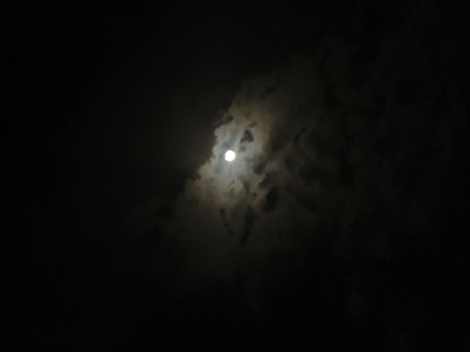 The image displays a nighttime sky over Homs, Syria. A bright, spherical celestial body, consistent with the moon, is prominently visible in the upper center-right portion of the frame. This moon is partially obscured by and illuminates a formation of dark and grey clouds, creating areas of varied brightness and shadow across the cloud structures. The sky surrounding the clouds is dark. No terrestrial features, human subjects, or man-made objects are visible within the depicted scene.