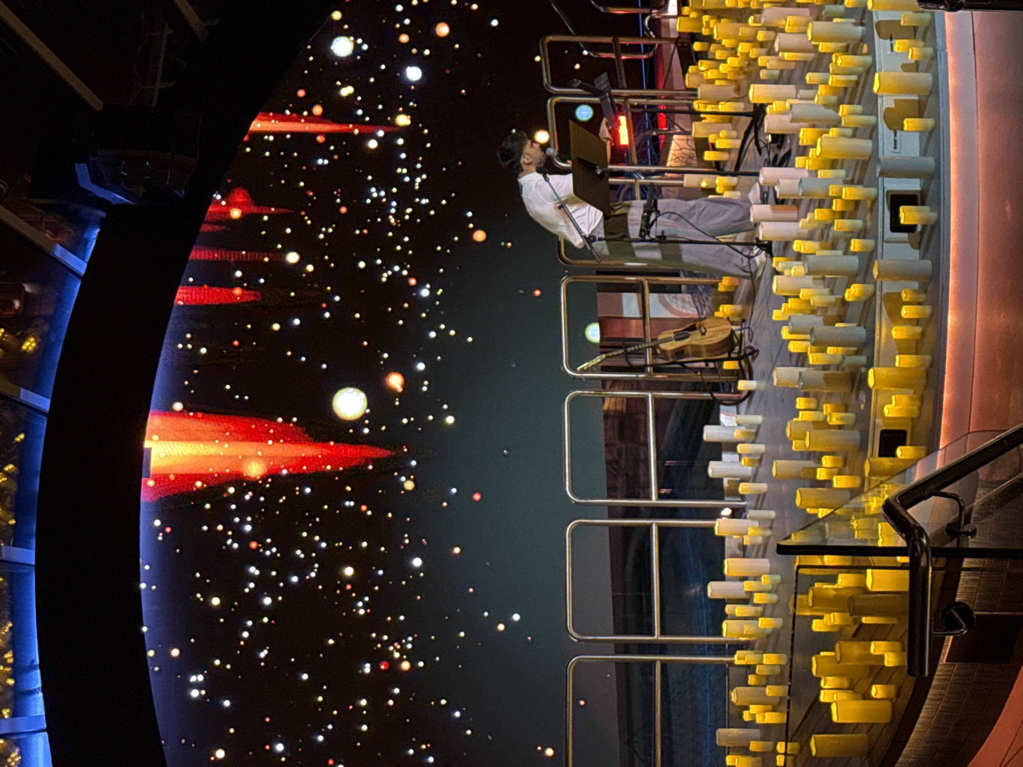 Here's a detailed description of the image: **Setting:** The image appears to be taken inside a high-rise building, likely a bar or lounge, based on the decor and setup. The location is unknown. **People:** One person is visible - a man sitting in a multi-tiered metal structure. He is wearing a white shirt and light-colored pants. He has dark hair and a beard. The man is positioned in front of a music stand with a microphone, suggesting he is about to perform. **Objects:** * **Multi-tiered metal structure:** The man is sitting within a metal structure, possibly scaffolding or a custom-built stage. * **Musical Instruments:** A guitar is resting on one of the tiers of the metal structure. * **Candle Wall:** There is a wall adorned with numerous white and yellow cylindrical lights, resembling candles. * **Bar/Counter:** A bar or counter is visible on the right side of the image, with a glass top. * **Large Screen:** To the left, there is a large curved screen displaying a dark space-like background with scattered yellow and white dots, resembling stars. There are also red streaks of light or effects across the screen. * **Windows:** To the far left, there are a few window panes visible with light reflecting off of them. **Actions & Interactions:** The man appears to be preparing for a performance, based on the position of the microphone and music stand. **Environment:** The lighting is dim and focused, with the "candle wall" and screen providing significant illumination. The overall atmosphere is modern and stylish, suggesting a high-end establishment.