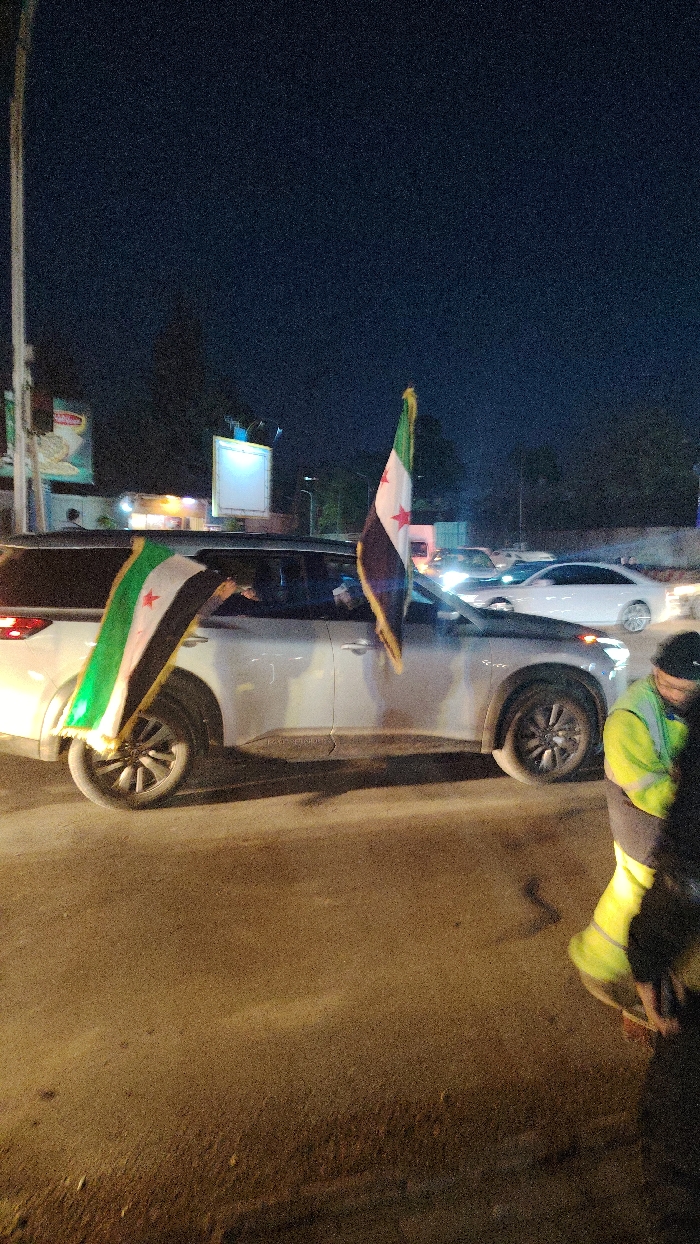 A silver SUV parked on a street displays two Syrian flags attached to its windows. The flags are rectangular, featuring three horizontal bands of red, white, and black, along with two green stars in the center. In the background, other vehicles and streetlights illuminate the dark setting. A person wearing a reflective vest walks along the sidewalk.