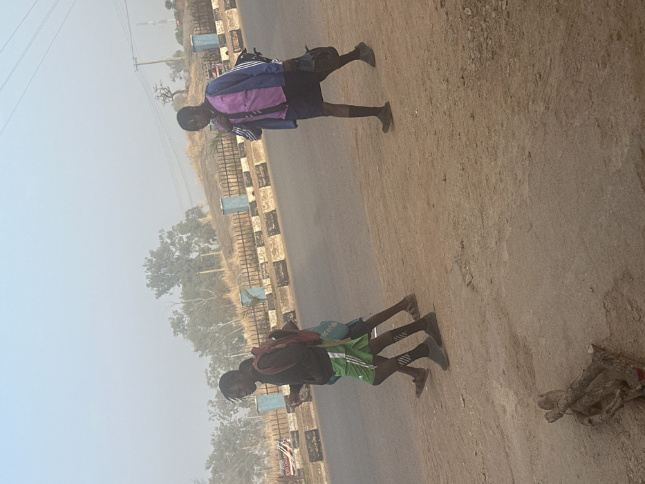 Two boys are walking along a road. One boy is wearing a blue and purple jacket with black shorts, a backpack, and shoes. The other boy has a black jacket, green shorts, and black shoes. The road is next to a strip of land with trees, fence posts, and flags with UNICEF's logo. The sky is hazy.