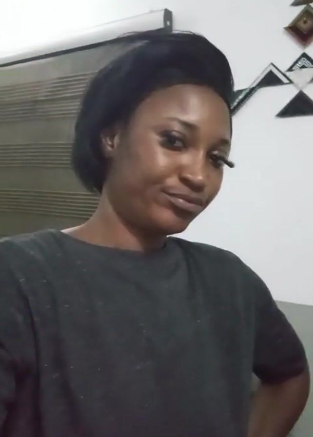 A woman with black hair stands indoors, facing the camera. She wears a dark gray t-shirt. Her hands are on her hips. The background consists of a white wall with geometric art and a striped window covering. The woman smiles at the camera and appears to be interacting in a conversation.