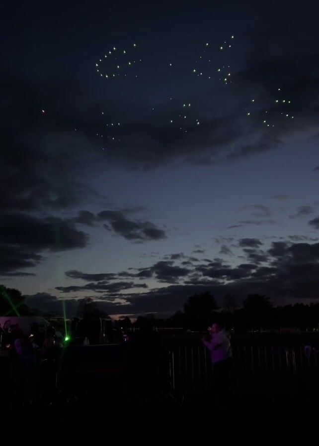 drone show in the night sky. The drones are arranged in the shape of five hearts. The hearts are made of green lights. People are watching the show from below. There is a fence in front of the people. There is a green laser beam in the bottom left corner of the screen. The sky is cloudy. It is dark.