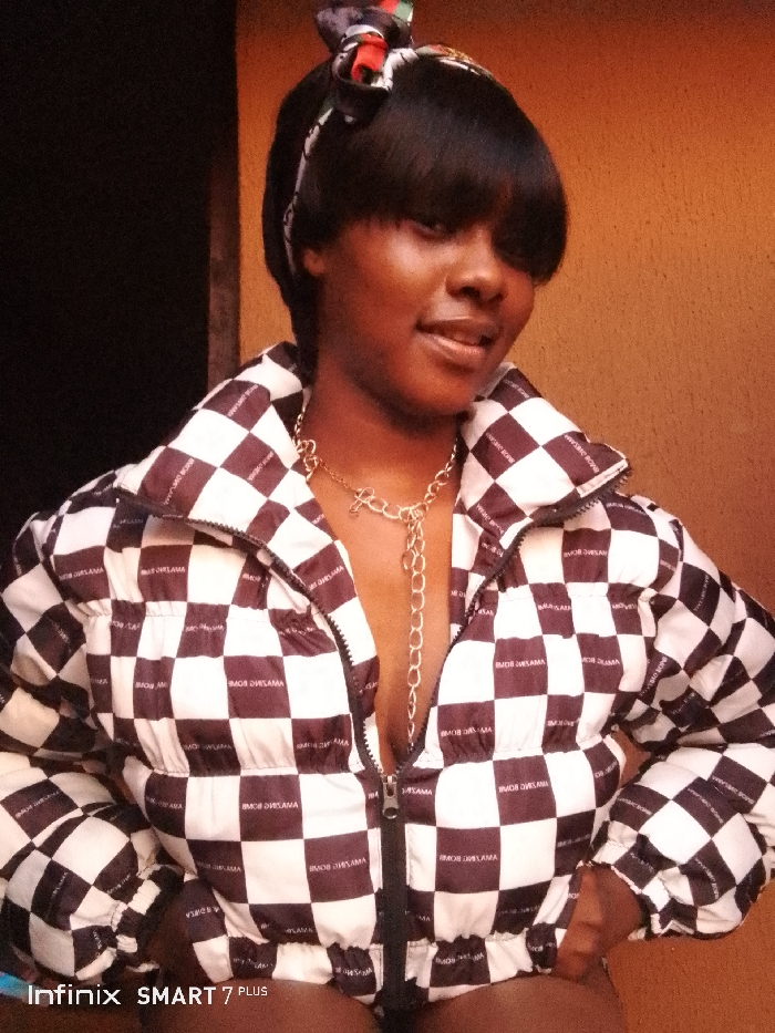 A woman with dark skin and short black hair styled with a fringe is the focal point of the image. She wears a patterned scarf around her head. The checkered jacket she has on features the text "AMAZING BOMB" on each square. A thick gold chain necklace with a charm is visible. The lower part of the image has the text "Infinix SMART 7 PLUS". The background consists of dark tones.