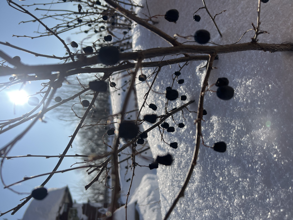 Black berries clinging to bare branches against a backdrop of snow under a bright, sunny sky