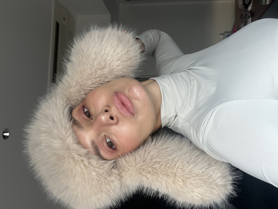 A woman with fair skin, accentuated by pink blush and full pink lips, stares into the camera. She wears a large, light beige fur hat with ear flaps. The rest of her attire is a seamless light gray bodysuit. The background includes a gray wall with a light switch and a glimpse of a cluttered area. The image appears to be taken in a slightly rotated portrait orientation.
