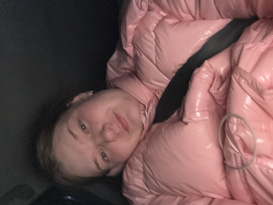 An adult female subject is depicted within the dark interior of a vehicle, in Garevaya, Russia. She has light-colored hair, a fair complexion, and a small, light-colored earring in her right ear. Her right arm is positioned with her hand near her head. The subject is wearing a glossy, light pink puffer jacket. A black vehicle seatbelt is fastened across her chest and abdomen, over the jacket. A light-colored hair tie is visible resting on the lower portion of the jacket. The subject is looking directly at the camera with a neutral expression, exhibiting a slight upturn at the corners of her mouth. The surrounding environment is indistinct due to low light conditions.
