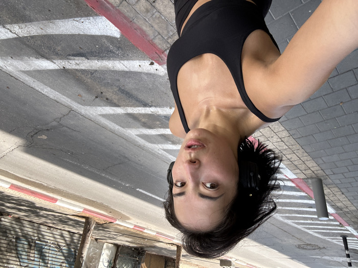 An overhead-angle selfie depicts a female individual on a paved sidewalk in Tel Aviv, Israel. The subject, with short, dark hair, wears black over-ear headphones and a black ribbed athletic top. Her skin on the face, neck, and shoulders appears visibly moist, indicating perspiration. Her mouth is slightly open. To the left on the sidewalk, two grey cylindrical bollards are present. The sidewalk, composed of grey interlocking pavers, abuts a street with an asphalt surface. The curb delineating the sidewalk from the street is painted red and white. White striped markings are visible on the cracked asphalt surface of the street. In the background, across the street, a tree trunk and a building wall with a closed, graffitied metal shutter are discernible. The scene is illuminated by strong daylight, casting defined shadows.