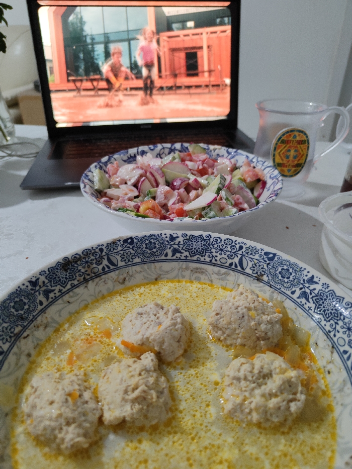 A laptop displays a scene of children playing outdoors, serving as a backdrop for a meal. A bowl of mixed salad with visible radish and cucumber sits near a glass of water. In the foreground, a plate holds soup with several pale meatballs. The setting suggests a casual, indoor dining environment.