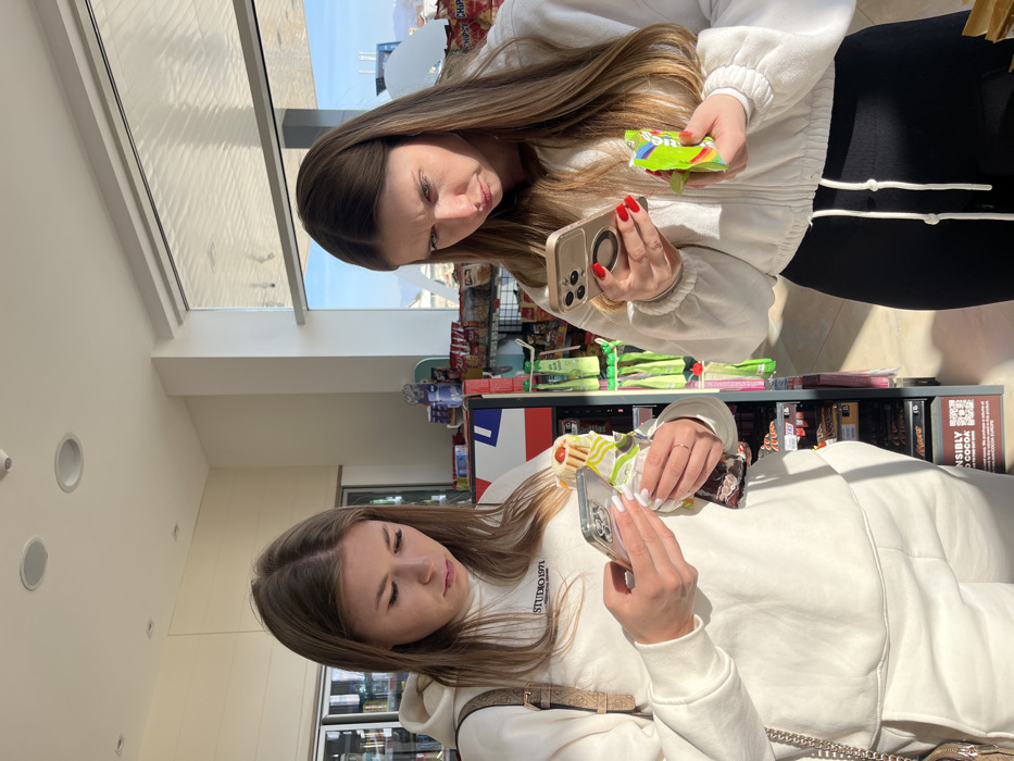 This image depicts an indoor scene within a convenience store or gas station shop, located in the city of Nikšić, Montenegro. Two young adult females are prominently featured in the foreground, each engaged with a smartphone. The female on the left, with light brown hair, wears a white hooded sweatshirt with "STUDIO 1971" printed on the chest and matching white sweatpants. She holds a silver smartphone in both hands, looking down at its screen. In her left hand, she also holds a partially unwrapped food item, possibly a hot dog, encased in a paper wrapper with green and white branding over a dark base. Her fingernails are painted white. A light-colored shoulder bag with a patterned strap is visible on her left side. The female on the right, also with light brown hair, wears a white, ribbed, cropped zippered top and dark-colored pants with white drawstrings. She holds a gold smartphone with a magnetic ring holder attached to its back in her left hand, looking down at its screen with a concentrated expression and a slight furrow in her brow. In her right hand, she holds an opened green and yellow package of snacks, revealing colorful candies inside. Her fingernails are painted bright red. The background features commercial shelving stocked with various packaged goods, including chips and candies, alongside a refrigerated beverage display unit and a red and blue retail stand. Large windows on the right side of the frame offer a view of an outdoor environment with distant hills or mountains under a clear sky. The interior is brightly illuminated by both natural light entering through the windows and overhead recessed artificial lighting fixtures. No direct interaction is occurring between the two individuals; both are focused on their respective devices.