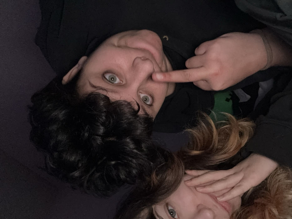 The image depicts two individuals photographed from a slightly overhead, tilted perspective against a dark, featureless background. The specific location within Stara Zagora, Bulgaria, is not discernible from the provided visual information. On the right, one individual with short, dark, curly hair and light-colored eyes (appearing greenish-grey) looks directly at the camera with wide eyes and a puckered mouth. This individual is wearing a dark, possibly black, hooded garment, with a hint of green fabric visible beneath on the left side of their chest. Their right hand is raised, with the middle finger extended and touching the tip of their nose. A light-colored band or bracelet is visible on their right wrist. On the left, partially visible, is a second individual with long, wavy hair, dark at the roots and fading to lighter brown/blonde ends. This individual's left hand is placed on their cheek, partially obscuring the lower face, and they are also looking towards the camera. They appear to be wearing a dark garment matching the other individual's attire. Both individuals exhibit direct engagement with the camera. The overall lighting is dim.