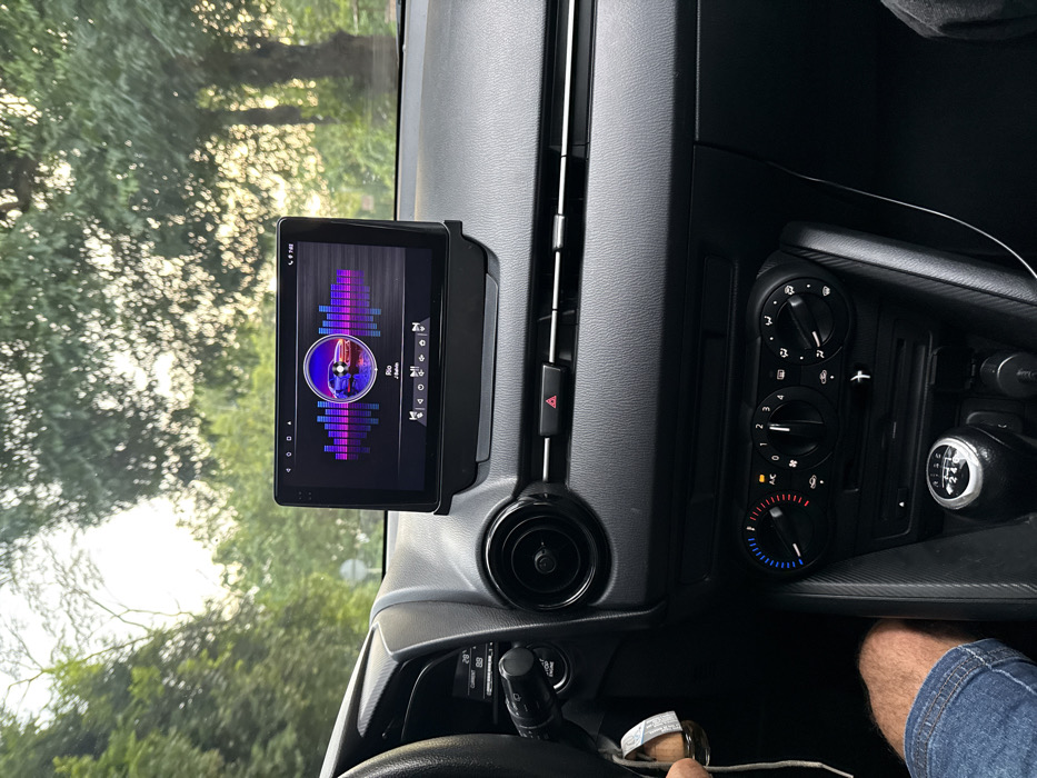 The scene depicts the interior of a vehicle from a passenger's perspective, located in El Robledal, Colombia. The dashboard is black and textured, featuring a prominent, horizontally oriented infotainment screen mounted centrally. This screen displays a music player interface with an equalizer visualization in purple and pink, a circular graphic containing images of two cars (one blue, one red), and the text "Río" by "J Balvin" at the bottom. The time "7:07" is visible in the upper right corner of the screen. To the left of the screen, a circular air vent is visible, and further left, part of a black steering wheel is seen. A person's left hand, clad in light skin, is gripping a key fob that hangs from the steering column. Below the infotainment screen, a red triangular hazard light button is active. Further down, three rotary knobs for climate control are present, one indicating temperature from blue to red, and the others controlling fan speed and airflow. A manual gear shifter with six forward gears and reverse is located in the center console. A portion of a person's leg, clad in blue denim jeans, is visible in the lower left of the frame, indicating the presence of a driver or front passenger. A charging cable extends from a port near the gear shifter. Through the windshield, a green, tree-lined environment is visible under daylight conditions, with diffuse light suggesting late afternoon. A small, indistinct white sign is partially visible in the distance through the foliage.