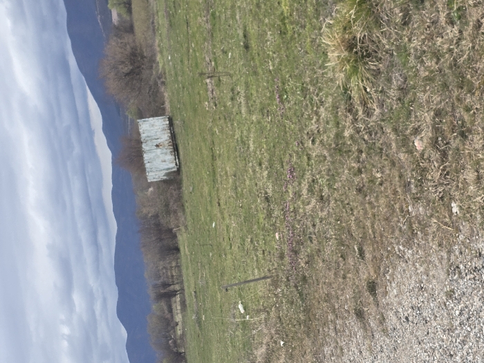 The image displays an unpopulated rural landscape within the city of Moskovets, Bulgaria, under an overcast sky. In the immediate foreground, a gravel path occupies the left side, transitioning into a grassy field that covers the majority of the lower frame. The grass exhibits a mixture of dry, light-brown patches and areas of new green growth, with several small clusters of purple wildflowers visible on the grassy incline. Two weathered wooden fence posts are present in the field; one is partially visible in the lower-left, and another stands further into the midground. Centered in the midground, situated on a grassy slope, is a large, rectangular structure, consistent with a discarded shipping container or makeshift shelter, exhibiting extensive weathering, peeling light-colored paint, and rust. Behind this structure, scattered deciduous trees and bushes, largely bare, are visible. The background consists of a series of dark, undulating mountains or hills stretching across the horizon, beneath a uniformly grey, cloudy sky. No human figures or active events are depicted.