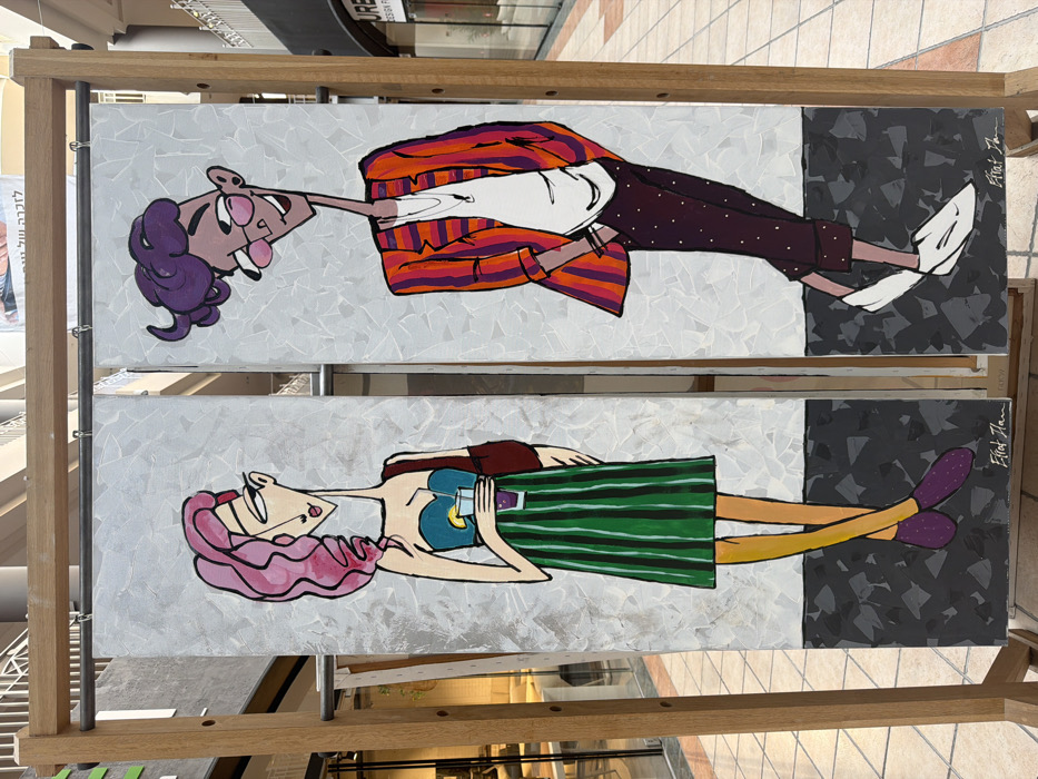 This image captures two large, vertical, stylized portrait paintings displayed side-by-side on a light wooden easel within an indoor commercial establishment, likely a shopping mall, in Bnei Brak, Israel