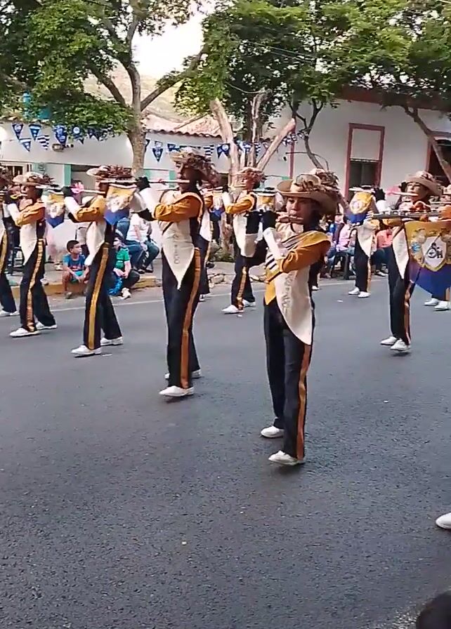 A parade marches down a street with trees on the left and spectators on the right. The parade consists of marching band members, wearing hats and uniforms of black, white, and gold, playing wind instruments. They walk in formation, maintaining a straight line. Some of the spectators are children. The video is oriented vertically.