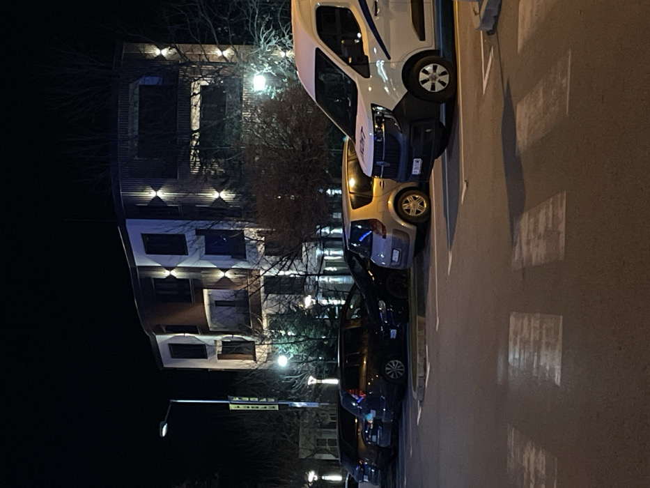 The image displays a nocturnal urban scene in Dupnitsa, Bulgaria. In the immediate foreground, a paved surface is visible, featuring partially faded white pedestrian crossing stripes. A circular raised curb is also present on the right side of the foreground. The midground features a row of seven parked vehicles. Closest to the viewer on the right is a white commercial van with blue diagonal stripes and a visible license plate reading "P 3611 MC." Immediately behind it is a gold/beige Renault Scénic minivan. Further to the left, a dark-colored station wagon, a black sedan, and two more dark-colored vehicles are parked in succession. The seventh vehicle, a dark SUV, is partially visible behind the second station wagon on the far left. In the background, a modern, multi-story building (at least four visible floors) dominates the scene. Its facade features a combination of white sections and darker vertical cladding, possibly wood or metal. The building is illuminated by numerous exterior up-and-down wall lights, creating distinctive diamond-shaped light patterns. Bare deciduous trees are dispersed around the parking area and the building, suggesting a colder season. Several streetlights are active, contributing to the overall illumination. A yellow vertical sign, appearing to read "HOTEL," is affixed to a lamppost on the far left. No individuals or apparent actions are depicted.