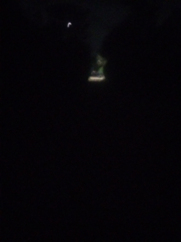The image presents a very dark scene with minimal illumination. A small, blurry structure is visible at the top center, consisting of a light-colored base and a green, indistinct upper portion. Above and to the left, a small, crescent-shaped light source is also visible. The remainder of the image is enveloped in complete darkness, making it difficult to discern any other details.