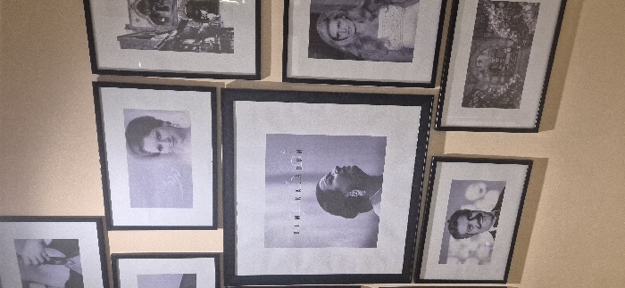 Nine framed black and white pictures adorn a peach-colored wall. The frames are all black. The photographs include portraits of people, one appearing to be a man in profile with writing to the side, another of a woman in what looks like a swimming pool, and what appears to be landscapes or buildings in a couple of the other pictures. The arrangement is asymmetrical, with varying sizes and positions of the frames.