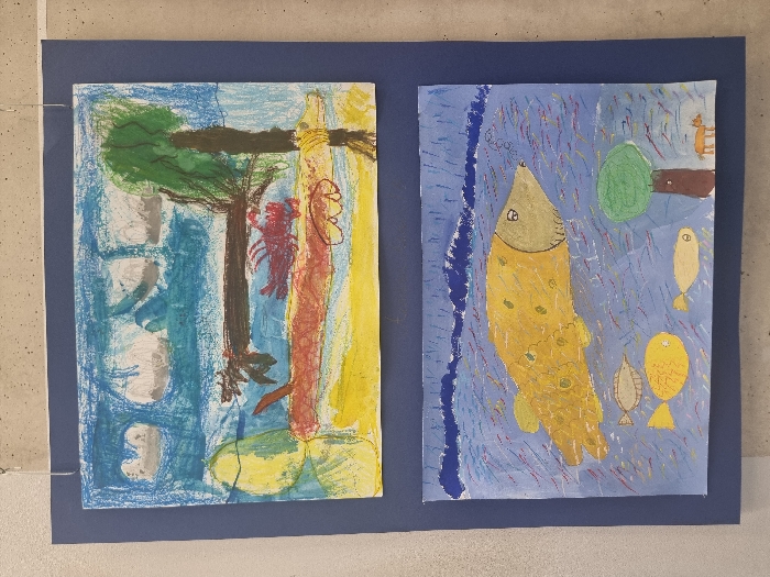 The image displays two horizontally oriented, unframed children's drawings, created with crayons or pastels, mounted vertically on a dark blue backing sheet. This assembly is suspended by thin wires against a light grey, textured wall in Jaunmārupe, Latvia. The upper drawing depicts a simplified landscape. The top third features a light blue sky with several irregular grey and white cloud formations. Below the sky is a strip of dark blue, representing water. The foreground comprises a vivid yellow ground, likely sand or land. A dark green tree with a brown trunk is positioned on the right side, extending from the yellow ground into the blue water area. On the yellow ground, left of the tree, a red, multi-legged creature resembling a lobster or crab is visible. Above this creature, a long, dark brown horizontal shape extends. An amorphous light green shape occupies the far left of the yellow ground. The lower drawing illustrates an aquatic scene with a small terrestrial element. The upper section of the drawing features a dark blue area with white wavy lines, suggesting the water's surface or deeper water. The primary water body is a lighter blue, filled with numerous short, multicolored crayon strokes in red, yellow, green, and blue, representing water currents or movement. A large, golden-yellow fish with a light brown head and distinct eye is centrally located, facing right, with small circular textural details on its body. Bubbles are depicted emanating from its mouth. Below this large fish, three smaller fish of varying sizes and beige-yellow coloration swim towards the left. In the bottom right corner, a green, leafy tree with a brown trunk is depicted on a small patch of brown ground. Adjacent to the tree's base, a small, four-legged brown animal, consistent with a fox or dog, stands.