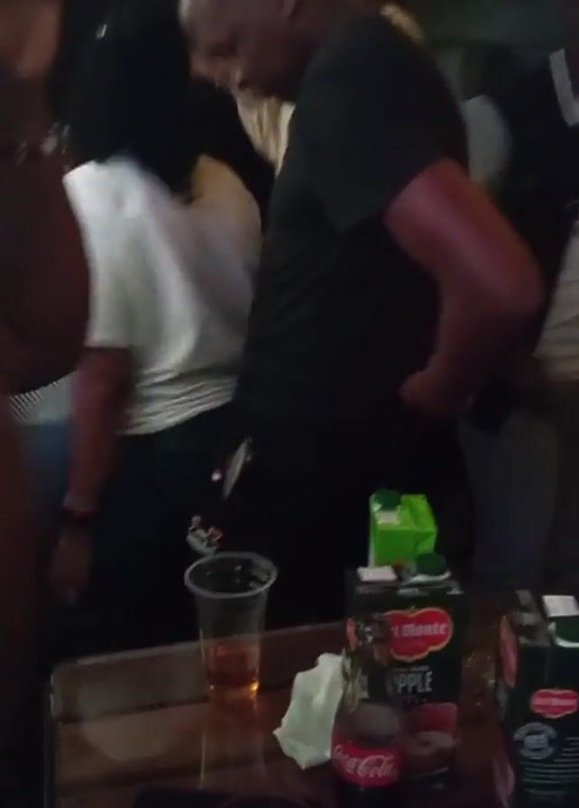 crowded indoor space, possibly a bar or nightclub, with people dancing and socializing. The camera appears to be positioned near a table with drinks, including Coca-Cola, juice boxes, and beverages in plastic cups. People are moving around, dancing, and generally enjoying themselves. The lighting is dim, with colorful overhead lights. The camera moves throughout the crowd, showing various people and their interactions. The atmosphere is lively and energetic.