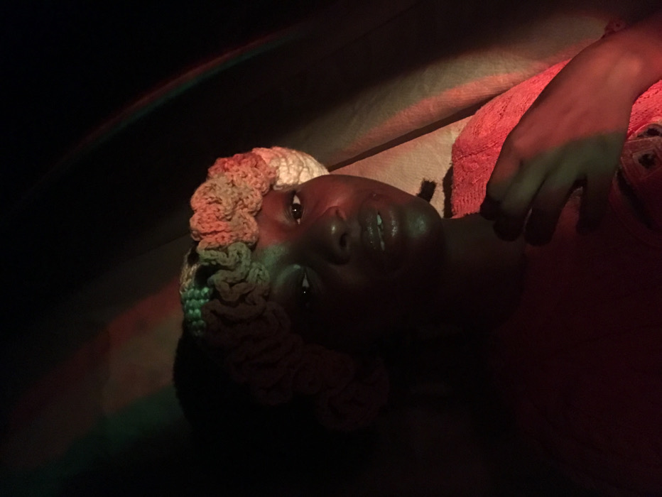 A person reclines, head adorned with a crocheted cap of white, pink, and green. The face is illuminated by a dim, direct light, emphasizing the nose and lips. An arm rests on a red fabric, appearing close to the face. The background is obscured by deep shadows, with a faint streak of red and green light adding to the dramatic mood. The person's eyes are visible, suggesting a moment of introspection or rest.