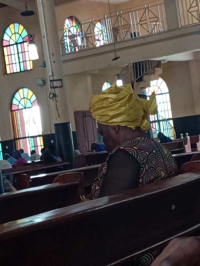 Inside a church, a woman wearing a yellow headwrap and a patterned top is seated in a pew, presumably praying or reflecting