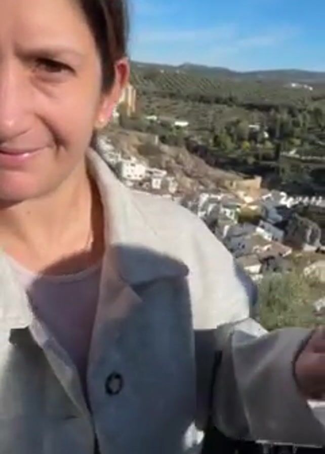 A woman stands outdoors on a sunny day, holding a smartphone and recording herself. She is fair-skinned, has brown hair pulled back from her face, and is wearing a light gray jacket over a pink top. In the background is a scenic view of a village with white buildings and a tower, set amidst rolling hills and trees under a bright blue sky. A metal railing is visible in the foreground, suggesting she is on a balcony or overlook. The camera is handheld and slightly shaky. She glances at the camera and smiles slightly. A man's voice, likely in the background, is audible.