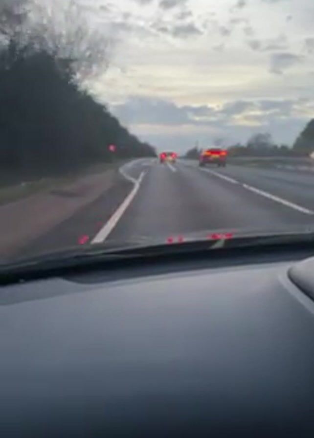 A car travels along a multi-lane highway at dusk under a cloudy sky. The road is wet, and two vehicles ahead of the camera car have their taillights illuminated. The car passes over road markings consisting of two forward-pointing arrows. A green tree line is visible to the left of the road. The car's dashboard is visible in the foreground.