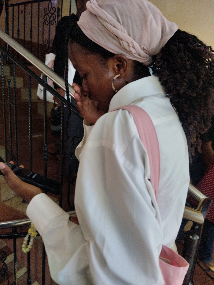 An indoor scene in Thika, Kenya, depicts a young adult African female near a staircase. The subject is viewed from a slightly elevated perspective, looking downwards with her right hand partially covering her mouth and chin. She wears a light-colored, long-sleeved button-up shirt and a light pink head covering, with dark, curly hair pulled into a ponytail. Visible accessories include a small nose stud, patterned hoop earrings, and a yellow beaded bracelet on her left wrist. Her left hand holds a dark-colored smartphone. A pink strap, likely from a shoulder bag, is visible over her right shoulder. In the background, a metal staircase railing with a silver-colored top bar and dark, ornate balusters is present. Out-of-focus figures are partially visible behind the railing. The floor is covered with reddish-brown patterned tiles, consistent with an interior public or commercial building.