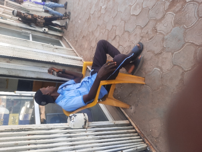 This image captures an outdoor street scene in Jos, Nigeria, under bright daylight conditions. A young adult male, with dark skin, is seated in the foreground on a bright yellow plastic chair. He wears a light blue short-sleeved collared shirt, dark trousers with a light blue stripe, and dark slides, with a black baseball cap worn backward. His body is angled to the right, and his gaze is directed off-camera to the right. He holds a small, dark object, consistent with an older model mobile phone or remote control, near his right cheek with his right hand. To the left of the seated man, a white, vertically corrugated metallic roll-down security shutter is partially open, secured by a white cylindrical mechanism. Behind him, a glass storefront is visible, reflecting some internal light, with indistinct items inside and partial text "ere" and "start" visible on the glass. The ground beneath him and extending into the mid-ground is paved with grey and tan interlocking concrete pavers in a tessellated pattern, with some dirt visible between the blocks. In the mid-ground to the right, three additional male figures are present. The closest wears a dark patterned long-sleeved top and pants, with headwear. Another man behind him wears a light-colored jacket over a dark top and blue jeans. The third figure is partially obscured further to the right. The background features additional elements of a commercial storefront.