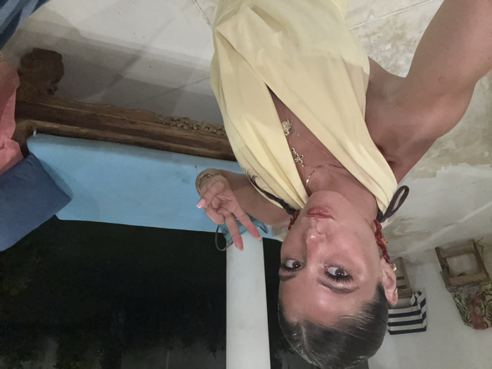 A female subject is depicted in a selfie, positioned centrally within a brightly lit patio or terrace area in Pecatu, Indonesia, at night